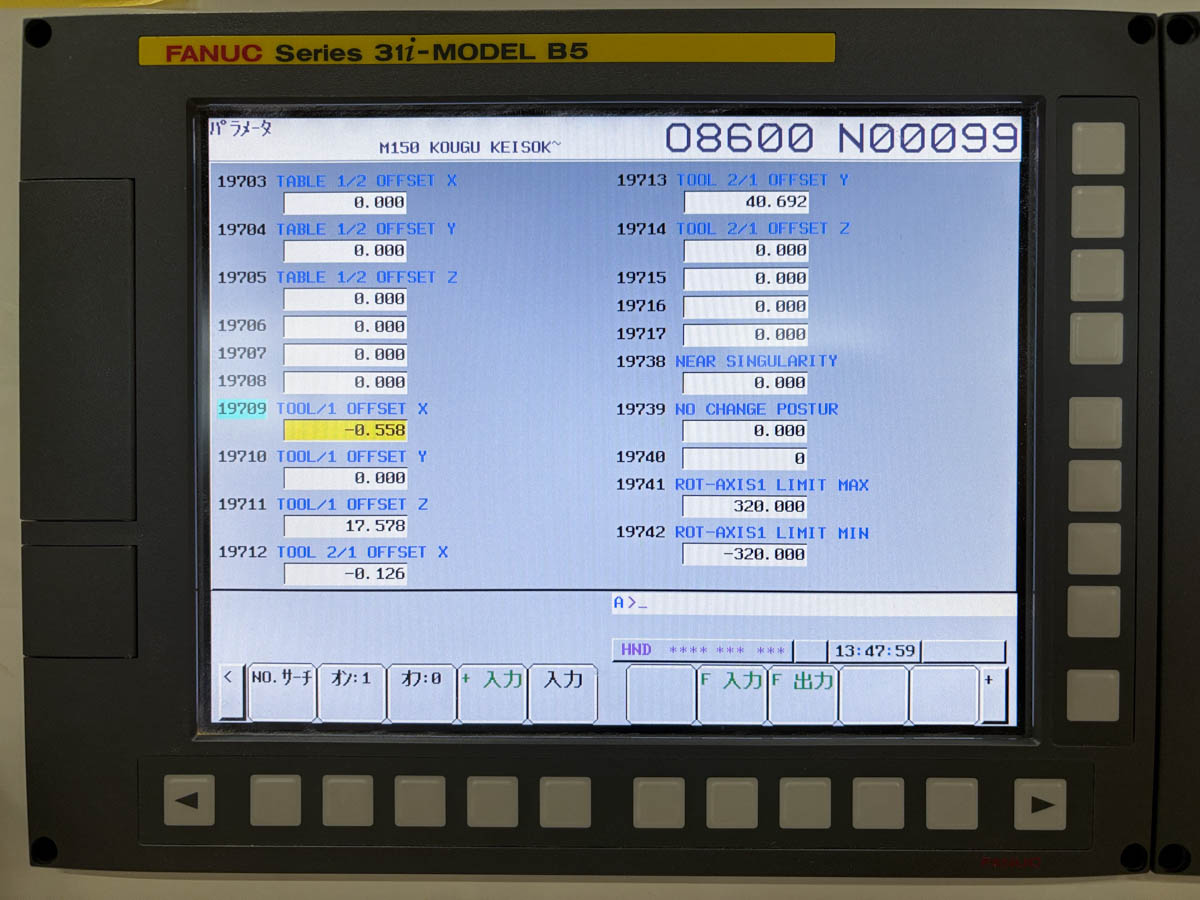 この機械はB軸旋回中心がY方向からZ方向に40°傾いています。しかし、この40°は設計値であり、実際の角度は40.01°あるいは39.99°のように誤差があります。それを実測して真の値をNCパラメータに設定します。